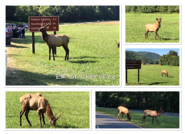 By now it’s mid afternoon and we were debating on whether or not we had time to drive into Cherokee to see if we could catch the elk that supposedly hang around the Visitor’s Center. Since we were only about 30 minutes away the vote was “Yes!” Sure enough, right as we approached the Visitor’s Center we could see several elk in a field up ahead – right by the road. Orange cones and cars lined the roadside for easy viewing. These guys were only about two years old (according to what we were told) but man were they huge! It was hot so they were getting ready to head into the forest just a few minutes after we arrived. Our timing was perfect! Obviously, they’re used to humans and, I kid you not, they actually stopped at the road to make sure cars weren’t coming before they crossed it. It was crazy! We actually caught one of them looking both ways before crossing. What a neat thing to witness!