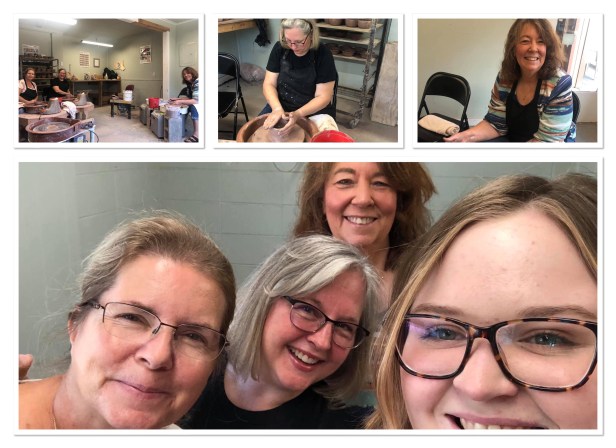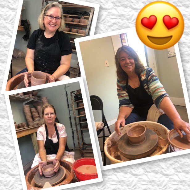 Thursday morning us girls had a pottery class at Fowler’s Clay Works with Hunter as our teacher. We had such a fabulous time back in May we wanted to do it again. Cindy and Sarah made bowls while my clay insisted on becoming a tool mug for my craft room. Hunter is so patient and such a wonderful teacher. This may become a tradition every time we’re in town. Can’t wait to get our finished products! On the way out Mike (Fowler) showed us some of his inventory and I can’t wait for the new products to hit the shelf! It’s so exciting!! I’ll be back to pick up more Fowler masterpieces in November!