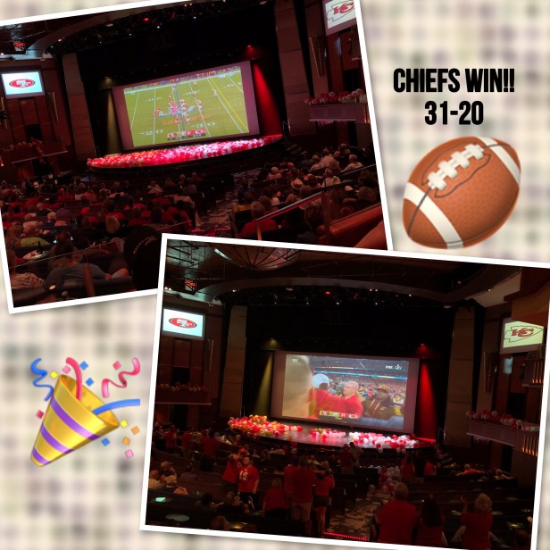 Came back to get ready for the big game! Super Bowl! Kansas City Chiefs vs San Francisco 49ers. The game was being played all over the ship (rooftop terrace, casino, staterooms and the main theater). Initially we wanted to watch it up on the rooftop terrace but the seating was so limited we could tell it just wasn’t going to happen. So we settled for the theater. There was all kinds of football food – wings, dogs, burgers, nachos, cookies, cakes, etc. We had a great time – about 75% of the theater was rooting for the Chiefs, as were we. It was a great game with a tight finish. What a fun way to spend Super Bowl!! Chief won 31 – 20!!