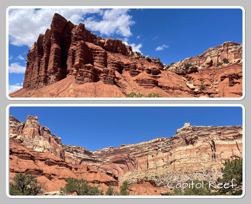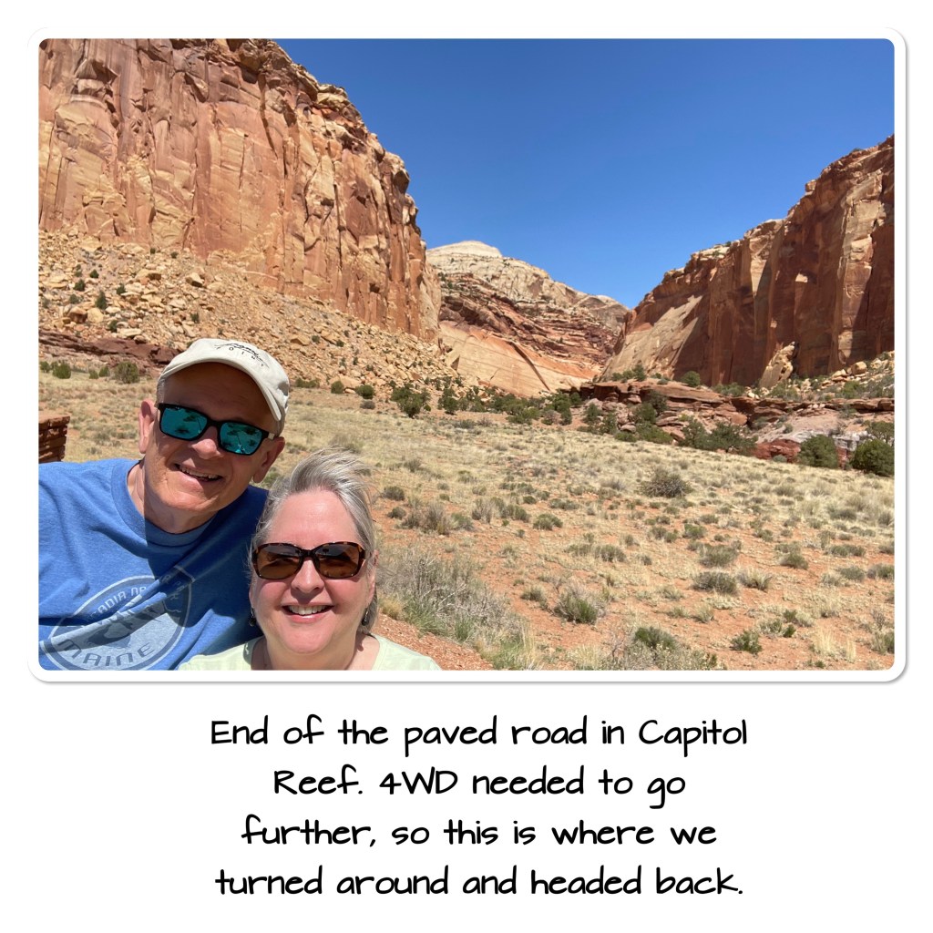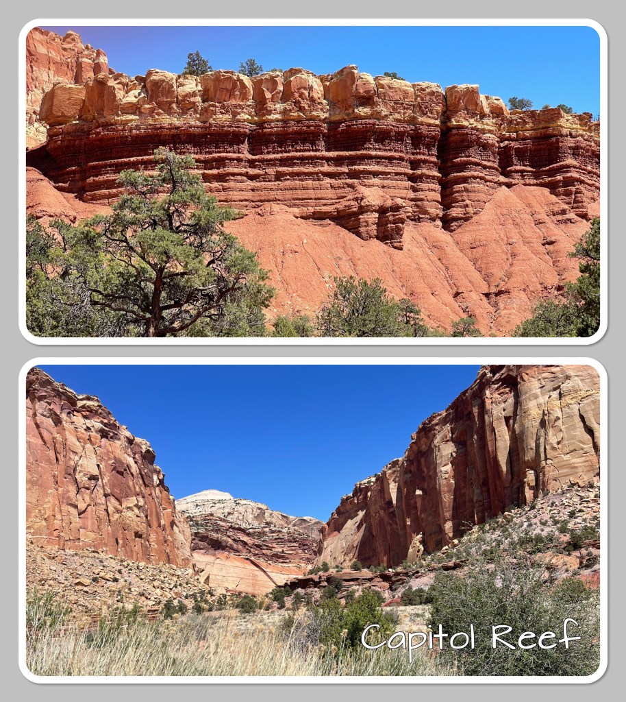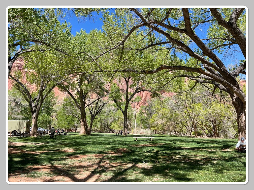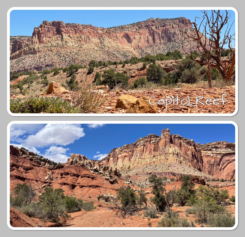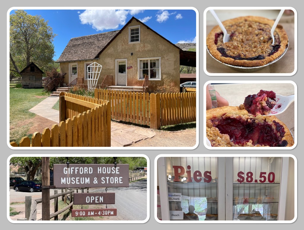 Bob had read about the Gifford House just down from the Visitor’s Center inside the park. They are known for their pies. So of course we had to grab one to try and add to our lunch fare. There is a beautiful little oasis park across from the house strewn with picnic table for just that purpose. We picked one and had our lunch surrounded by the cliffs of Capitol Reef.