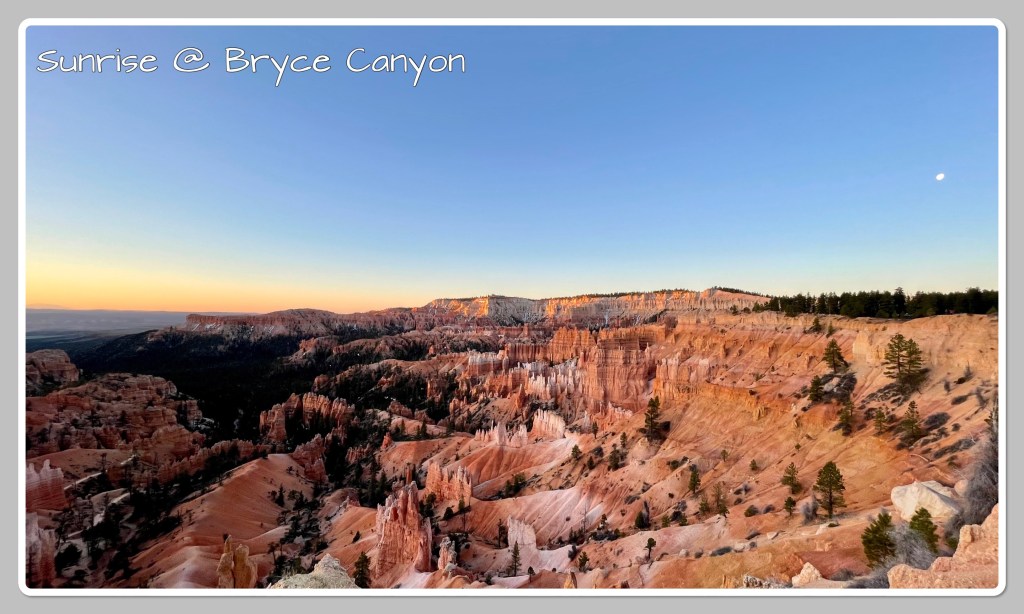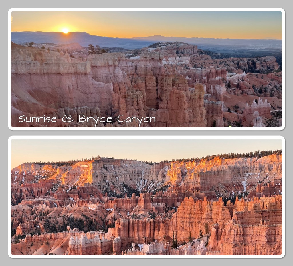 Our day started with a 5:45 alarm for a 6:24 sunrise on the rim. It was a brisk 34 degrees with a slight breeze. There is a Sunrise Point viewing area, but honestly there isn’t a bad spot on the rim. It was challenging trying to keep the body heat up while waiting on that big orange ball to make its appearance. (And … note to self: when you’re at 7000-8000 feet, it takes a little longer for that big orange ball to come up over the horizon. So next time, sleep a few minutes longer.) Eventually, I started to see light shining on the cliffs across the canyon and once it started it was like magic watching the progression. It was a clear morning so not filled with color but still absolutely gorgeous and worth every shiver.