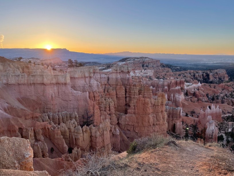 Our day started with a 5:45 alarm for a 6:24 sunrise on the rim. It was a brisk 34 degrees with a slight breeze. There is a Sunrise Point viewing area, but honestly there isn’t a bad spot on the rim. It was challenging trying to keep the body heat up while waiting on that big orange ball to make its appearance. (And … note to self: when you’re at 7000-8000 feet, it takes a little longer for that big orange ball to come up over the horizon. So next time, sleep a few minutes longer.) Eventually, I started to see light shining on the cliffs across the canyon and once it started it was like magic watching the progression. It was a clear morning so not filled with color but still absolutely gorgeous and worth every shiver.