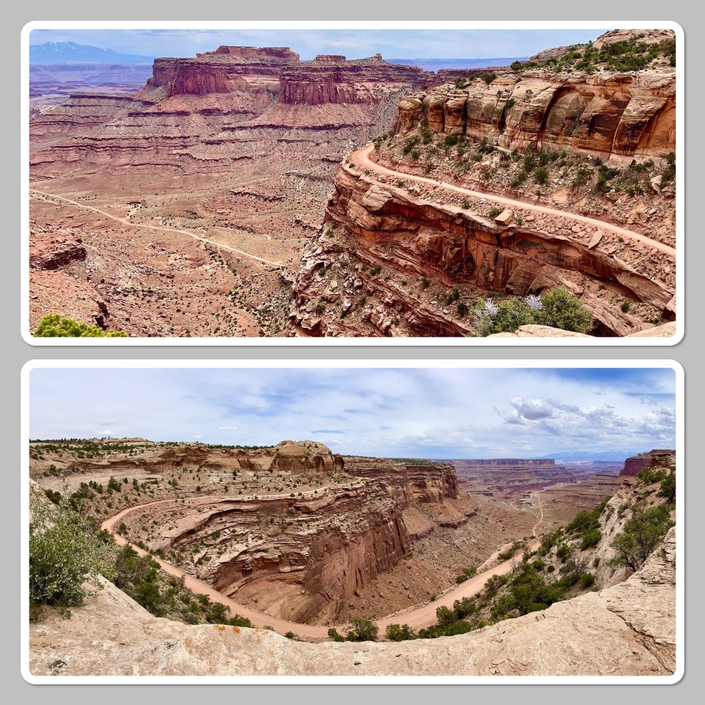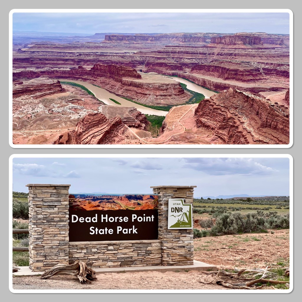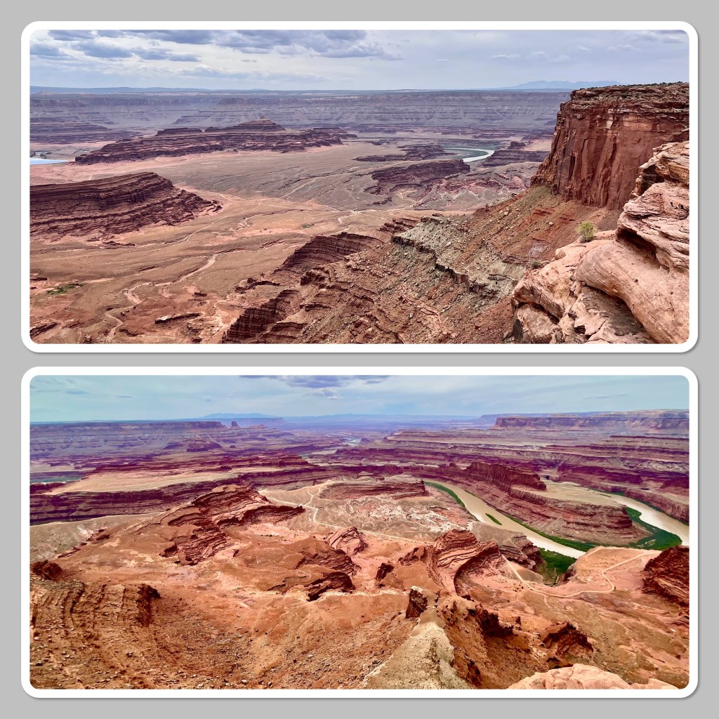 However, some points of interest … I had to do some research to see where in the world a name like Dead Horse State Park came from. I gotta tell ya, it ain’t pretty. You can probably guess part of it, right? The main theory I could find was that cowboys would steer the wild mustangs through the narrow passage onto the natural plateau, choose the ones they wanted for personal use or to sell and leave the rest to die up there with no water. There are different variations but that’s the basic gist. I got nothing. One a lighter note though, it’s also where Thelma and Louise drove off the cliff. LOL