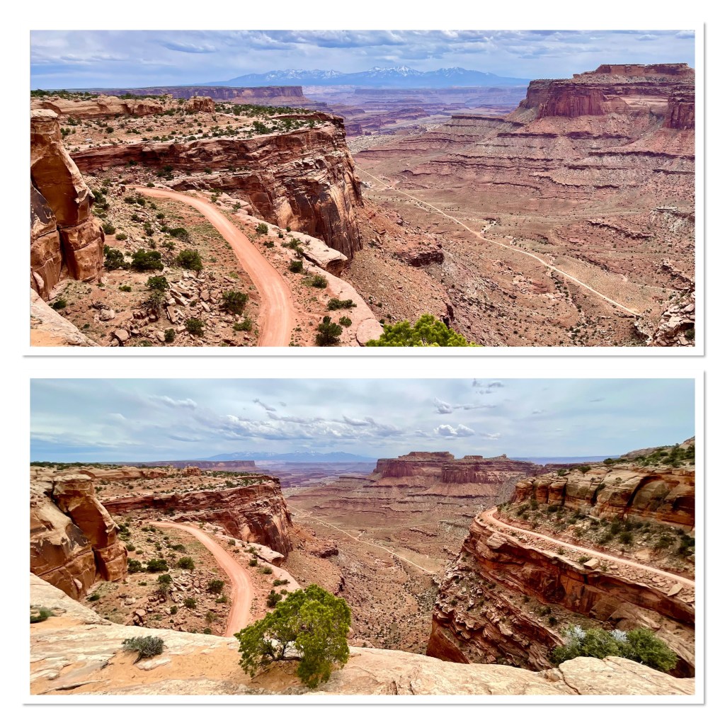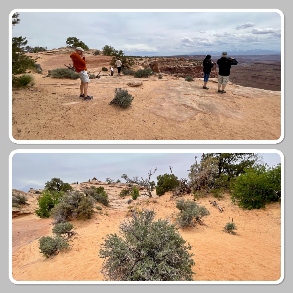 The Island in the Sky part of Canyonlands is another small park and there aren’t many viewing points along the way. In fact a lot of the drive from one point to another is rather bland. So just as in not many pics from Dead Horse, not many from this part of Canyonlands either. If we had hiked I’m sure there would’ve been more but it wasn’t meant to be this time. It was really difficult to get images that would show the definition between the edge where you’re standing and the vast canyon below. It really is enormous. I’m sure the overcast sky didn’t help with lack of lighting and colors showing through. I did fall in love with the way both parks landscaped their viewing areas. The trees, bushes, flowers, the petrified pieces of wood all over the place. All of it truly is a photographer’s playground. Side note: this is the only park we’ve been to where you had to work for the shot at the overlook area, vista point, or whatever it’s called. At most of them you park, walk to the edge and that’s it. At these parks, you can just keep going all over the place, scrambling as far out as you dare for the perfect shot.