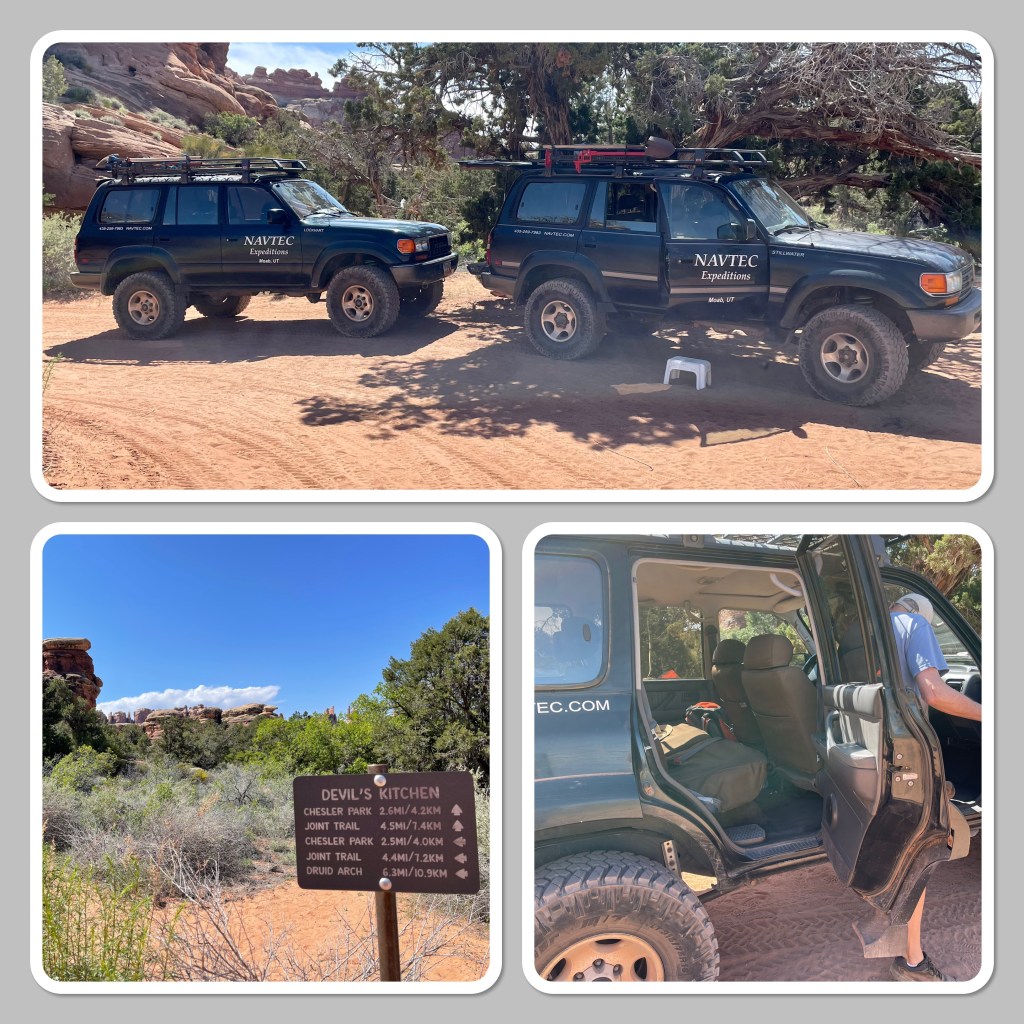 Back in December Bob booked a guided tour excursion through the Needles district of Canyonlands with NavTec Expeditions. The only way to see this part of the park is to backpack it, hike it and/or 4WD it. Since we aren’t going to backpack it (10.7 mile loop), booking a tour was the only way we would get to experience it. NavTec Expeditions is a local family owned company that offers all kinds of tours in the area. Charlotte (our guide) was here at the hotel at 8am to pick us up for our adventure this morning. (Side note: Um, this thing must be 3’ off the ground and she forgot her stool. 😳) It’s 65 miles just to get to the park so we’ve got some time to get to know each other. Normally, the company requires a minimum of three for an excursion so we were very thankful they didn’t cancel us because it was just the two of us. Nothing like a person tour!