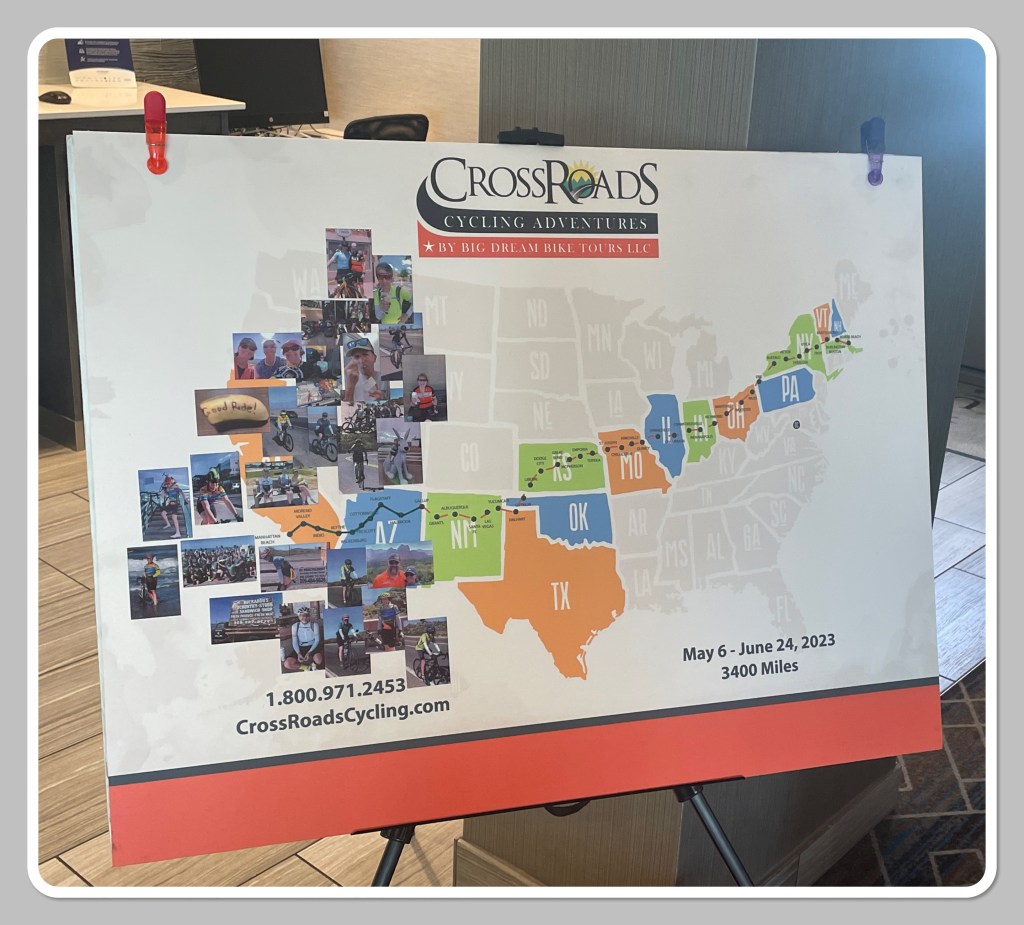 There was a cross country biking group staying at the hotel last night. We talked to a couple of people to find out exactly what they’re doing and got a picture of their map. They started out on May 6 in Los Angeles and will be in Boston by June 24. It looks like a group of about 25 cyclers looking at photos on the map. And we are not talking youngsters either. Pretty awesome stuff. When we checked into the hotel tonight I did a little digging. The company is Big Dream Bike Tours and HERE is a link to their site. Consider my mind blown! If you’re interested, click around on that site a little bit. The amount of miles they ride a day is 39 to 100 with an average of around 80. There’s a link to some of the participants’ blogs as well. And what it costs to do this? WOW!