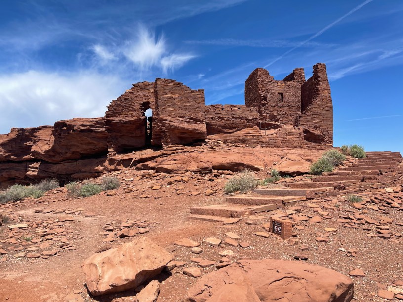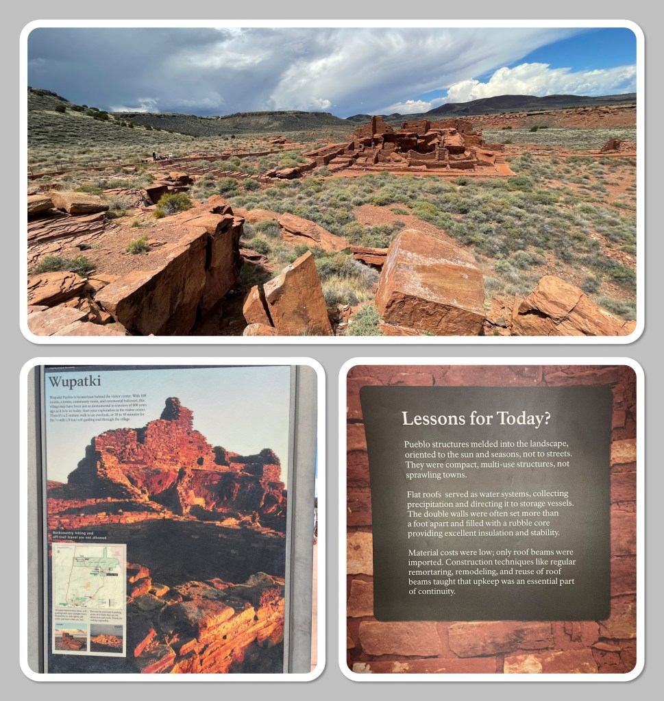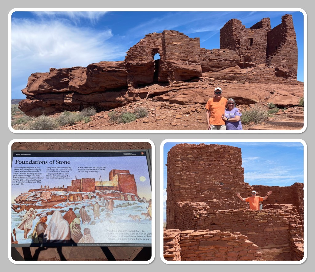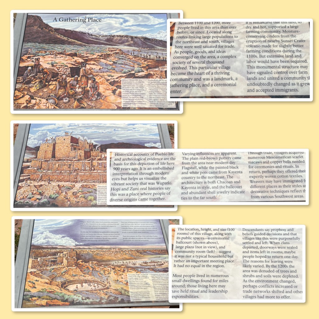 Our original plans were to drive to Page, AZ and check out Horseshoe Bend Park and the Glen Canyon Dam before checking into our hotel. While on Rt 89 Bob saw a sign for Sunset Crater Volcanic National Monument. Oh a whim he whipped the car to the right and we decided to at least check it out. Bob has a Lifetime Senior Pass for the national parks. We had no idea it would get us into all the National Monuments too. We need to start paying attention to those when we travel. This is a 2-in-1 park because on the other end of it is the Wupatki National Monument, which contains ancient ruins of villages built 900 years ago. All that on a 34-mile scenic loop drive! Sounds like a good pivoting idea to us!