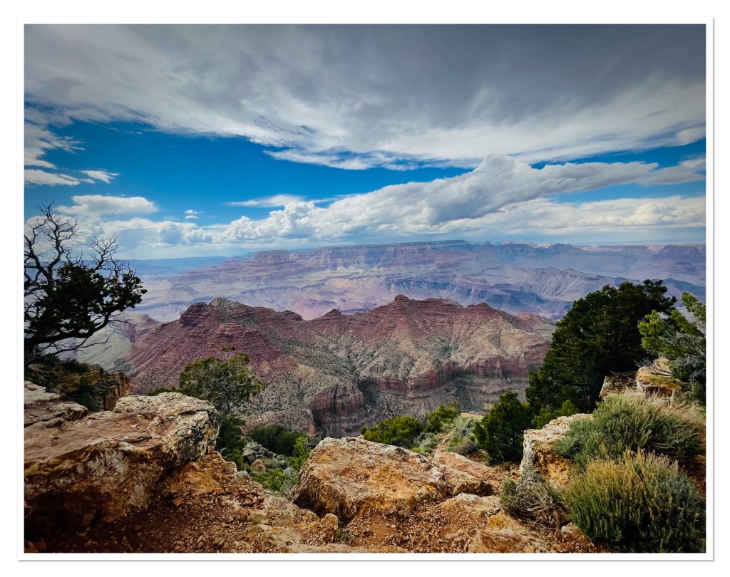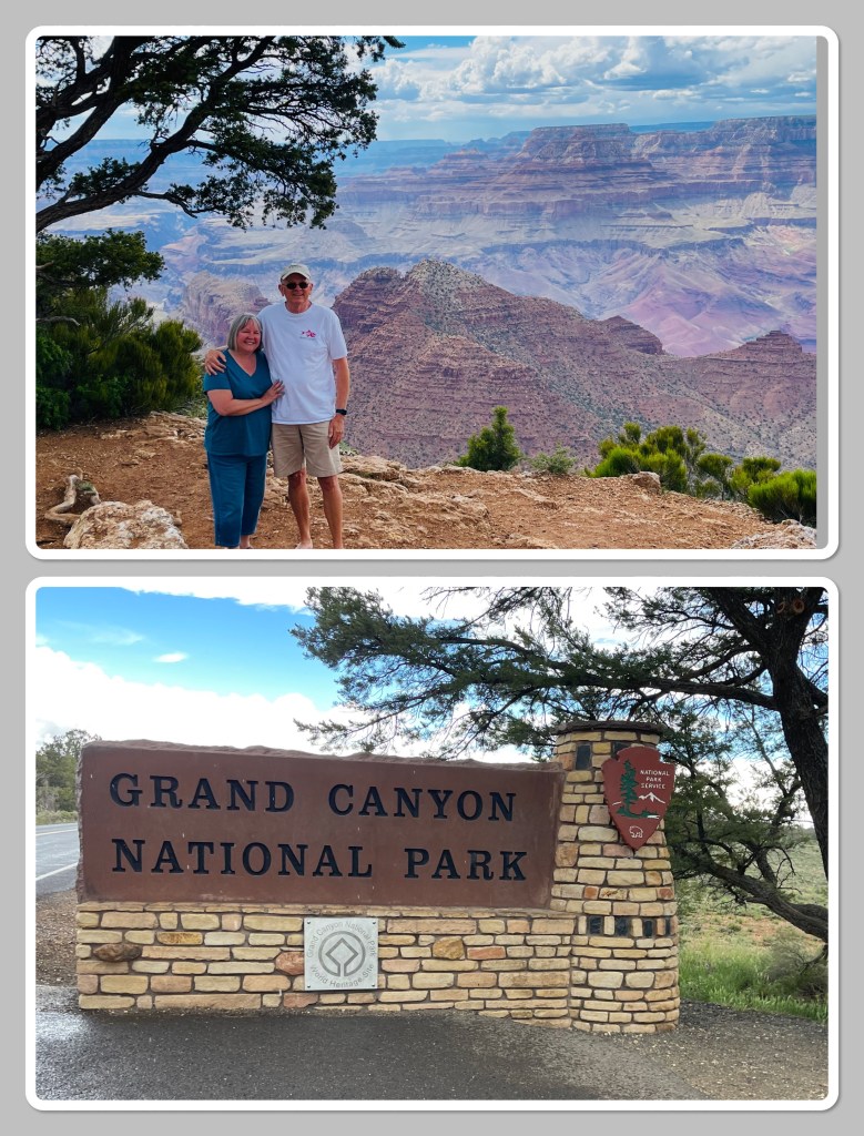 It was around 3:30 by the time we made it to the park. We did hit a few overlooks and I took some pictures but there was a storm brewing just behind us and every time we got out of the car we heard thunder. But the light over the canyon was beautiful so it was hard to walk away from it. Between the storm and our lagging energy because we needed food, we elected to just skip the rest of the overlooks today and go straight to the lodge and check in. Ten years ago we were at the North Rim and we knew the South Rim was much busier and populated but man there’s a lot of people, cars, buses, etc in this little section. We only have one full day here so we’ll make the most of it. We grabbed a really early dinner (it was 4:30 by now) in the cafe at the lodge. By the time we came out that storm that had been brewing all afternoon was beginning to burst.